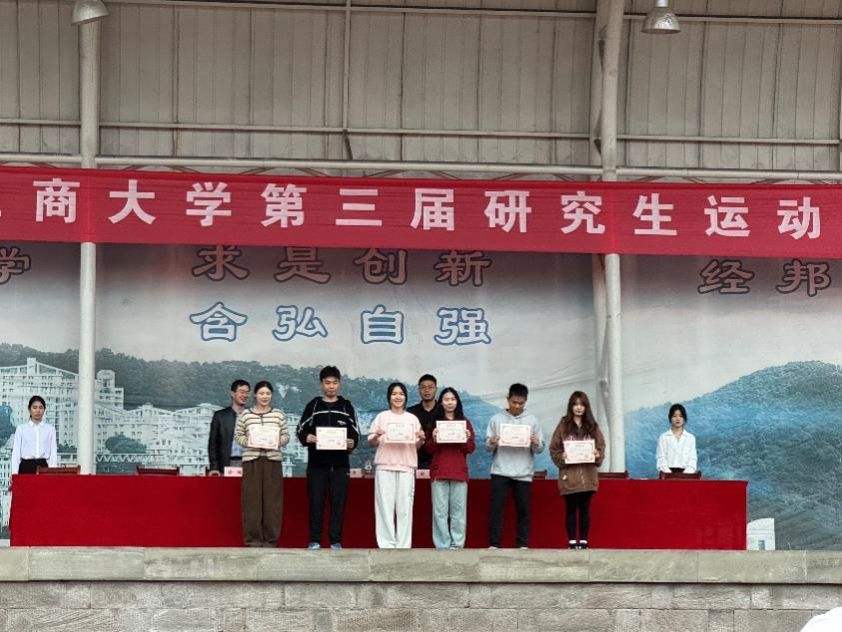 15日下午17时,本届研究生运动会闭幕式在南岸校区南区田径场举行。重庆工商大学研究生院院长杜力、副院长郑强以及研究生院教师徐阔为获奖团队颁奖。