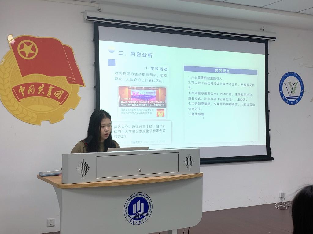 培训开始,王雨佳首先分享了自己的工作经验。此次分享分为三个部分:新闻稿写作、推文排版以及新闻图片拍摄。王雨佳最先从公众号内容和文案要点内容进行分析。她以高校公众号为例,从学校活动、典型人物、荣誉播报等几方面进行讲解。在新闻稿的撰写上,王雨佳从标题、导语、主体、结尾四部分上做了简要分析。在推文与排版上,她告诉了大家排版要点,例如整体基础格式与封面与标题。在此之外,王雨佳还给大家讲了一些语句强调方式和小技巧为了大家更好地进行账号建设。