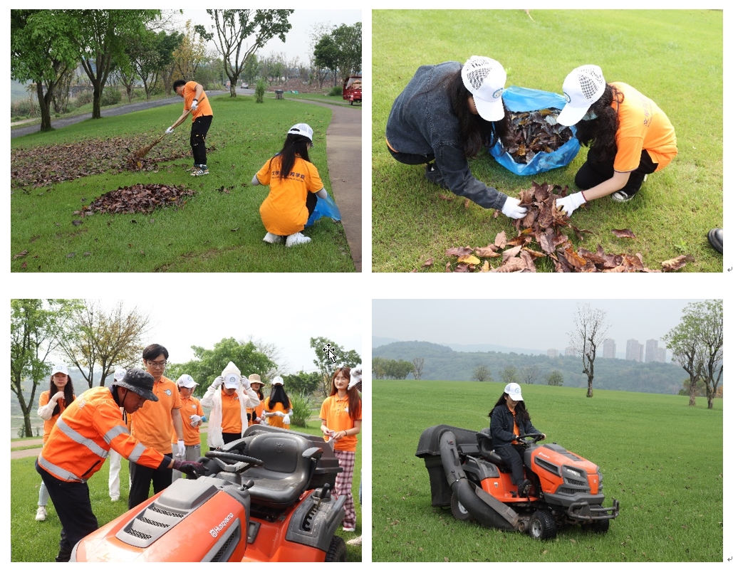 上午九点,在了解此次活动具体服务内容、熟知操作细节之后,志愿者们来到作业区域开展劳动服务志愿活动。志愿者们首先将散落在草坪上的黄桷树树叶搜集打包,辨认草坪中的杂草并将其清除,全身心投入到热火朝天的服务工作中;接着,志愿者们在左岸工作人员的指导下,学习了草坪修建车的相关驾驶内容,亲身上手实践体验尝试,在具体操作中体会到了科技创新给我们生活带来的便利不容小觑。