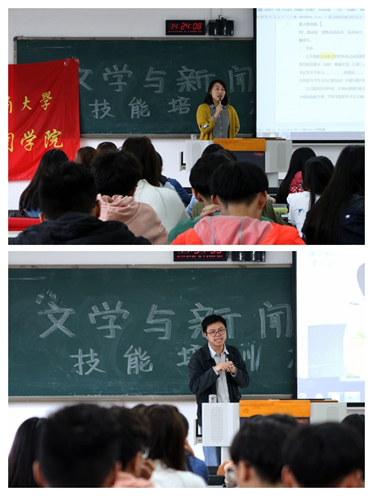 会议伊始,文新学院分团委书记孔海啸老师就新闻稿的写作方法向同学们进行讲解。孔老师以一篇学生写的新闻稿实例出发,讲解了新闻稿的三段式结构,分析了新闻稿的写作技巧和注意事项。王涛老师则就如何正确拍摄新闻图片,向同学们分享了经验。他将新闻图片的正反素材进行对比,从构图、角度等方面对新闻图片的拍摄要领进行了详细讲解。