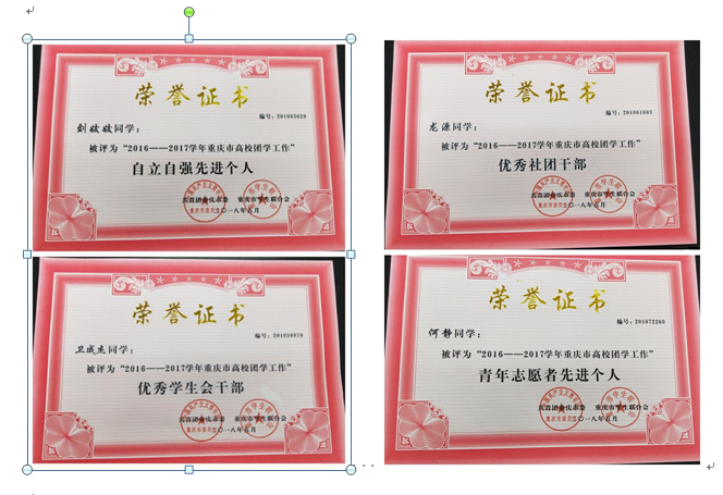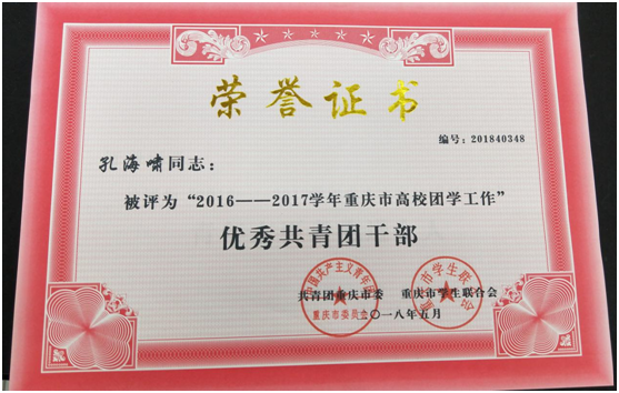 经过激烈比拼,新葡的京集团35222vip孔海啸老师获评2016——2017学年重庆市高校团学工作“优秀共青团干部”荣誉称号;新葡的京集团35222vip刘娇娇同学获评2016——2017学年重庆市高校团学工作“自立自强先进个人”荣誉称号;卫成杰同学获评2016——2017学年重庆市高校团学工作“优秀学生会干部”荣誉称号;龙源同学获评2016——2017学年重庆市高校团学工作“优秀社团干部”荣誉称号;何静同学获评2016——2017学年重庆市高校团学工作“青年志愿者先进个人”荣誉称号。