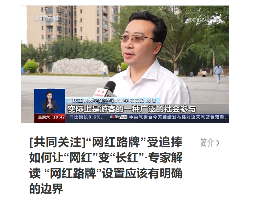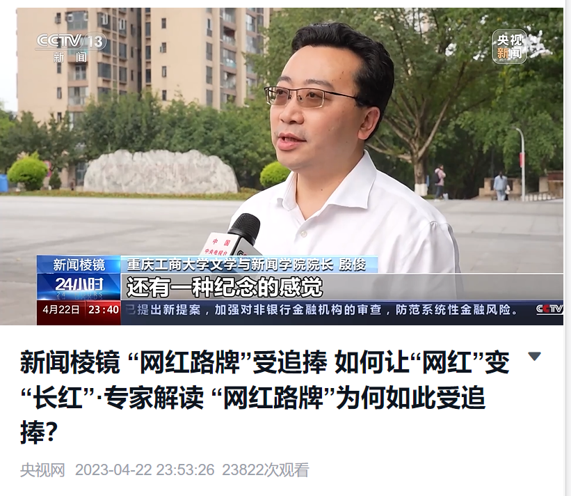 4月22日、4月23日,中央广播电视总台CCTV-13新闻频道新闻棱镜栏目、共同关注栏目分别播出《“网络路牌”受追捧 如何让“网红”变“长红”·专家解读:“网红路牌”为何如此受追捧?》,新葡的京集团35222vip新葡的京集团35222vip院长殷俊教授接受专访,就如何让“网红”变“长红”进行解读。