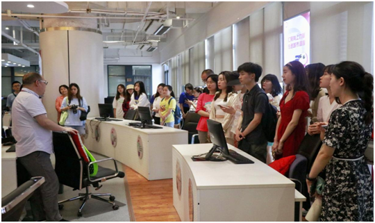 参观过程中,上游新闻工作人员邓瑶向同学们细致介绍了上游新闻包括APP下载量、日均访问量、日均发稿量等具体信息,并着重介绍了上游新闻所开创的如帮帮、新闻爆料、炫视频等互动化特色板块,邓瑶介绍说这些特色板块都开通了评论、分享、收藏、点赞等互动功能,上游新闻用户已能直接参与到内容的生产和传播环节中。