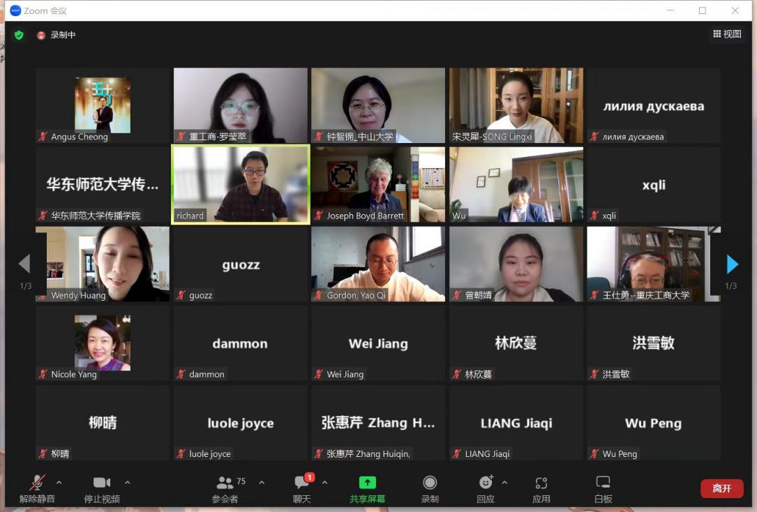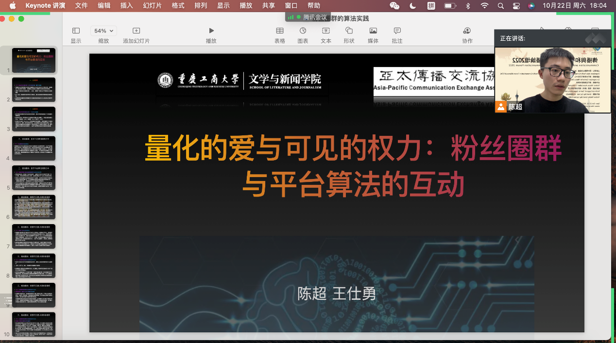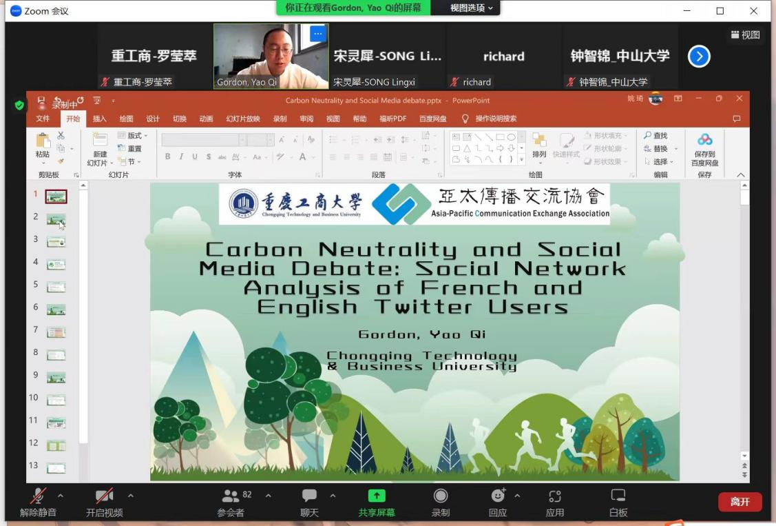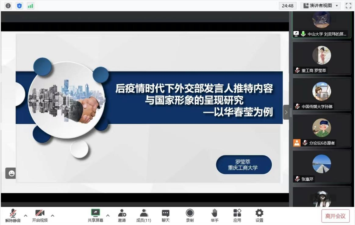 会议期间,王仕勇教授在两个分论坛中进行了点评和总结。姚琦博士担任此次论坛的主旨演讲人做了题为Carbon Neutrality and Social Media Debate:Social Network Analysis of French and English Twitter Users的发言,并主持两个分论坛。此外,新葡的京集团35222vip四名研究生陈超、许珂、罗莹萃和曾朝婧在分论坛做了题为《量化的爱与可见的权力:粉丝圈群与算法的互动》、《被忽视的力量:积极网络舆论的要素、重要性与培育路径》、《后疫情时代下外交部发言人推特内容与国家形象的呈现研究》和《他者视阈下北京冬奥会的中国形象研究》的报告,向与会的各地区同行们展示了新葡的京集团35222vip最新的研究成果,深化了学术交流,并引起了同行们的极大兴趣,获得广大与会代表的赞赏。