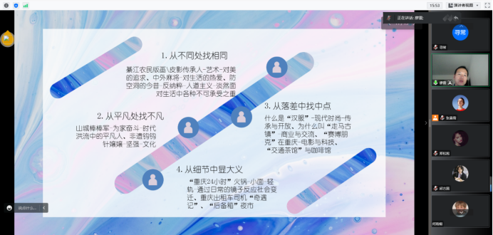 针对对外传播中国的选题,廖雷首先提出“不装大、不装老、不装小”三个要求,并结合《红高粱》等影视作品对外传播的案例进行了生动的说明。接下来,廖雷对对外传播的对象、形式、内容、价值和效能之间的关系进行了分析,强调了传播对象对传播效能的决定性作用,指出目标受众是影响选题的关键。最后,廖雷结合同学们提交的“讲好中国故事”选题,给出了“从不同处找相同”“从平凡处找不凡”“从落差中找中点”“从细节中显大义”四条建议。