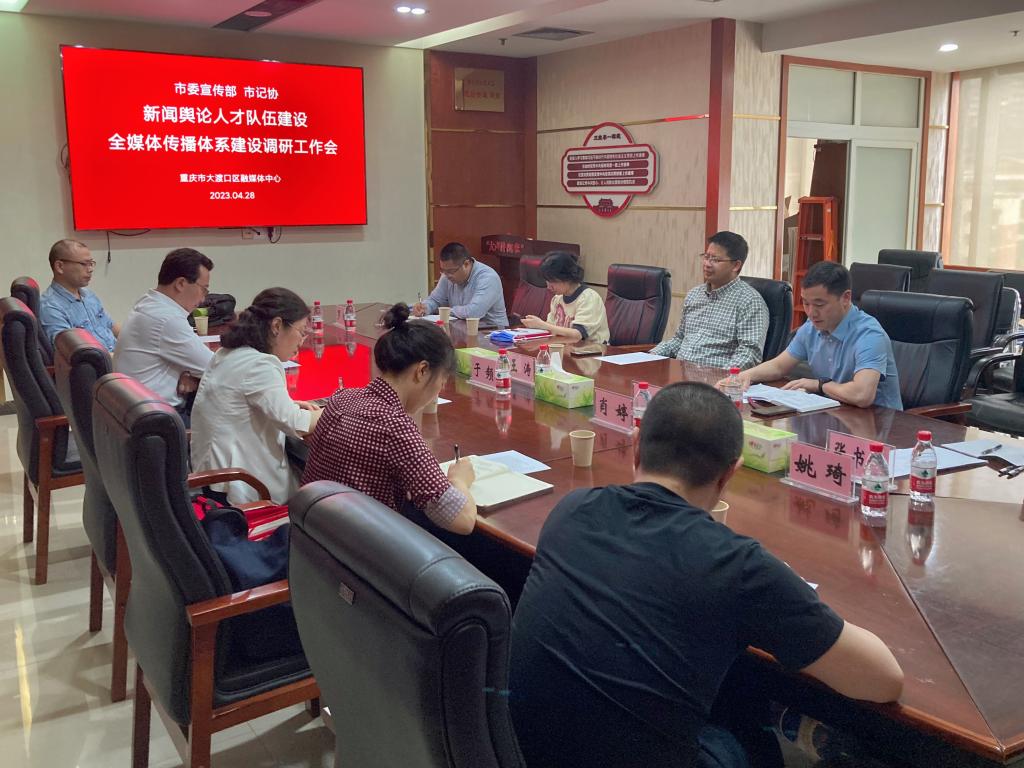 4月28日下午,新葡的京集团35222vip与重庆市大渡口区融媒体中心共建实习基地。学院党委书记于频、院长殷俊、广告系系主任王凌峰、新媒体系系主任姚琦等一行前往大渡口区融媒体中心签约,并与该中心主任王涛、副主任冯勇等进行了调研座谈。座谈会由大渡口区融媒体中心主任王涛主持。