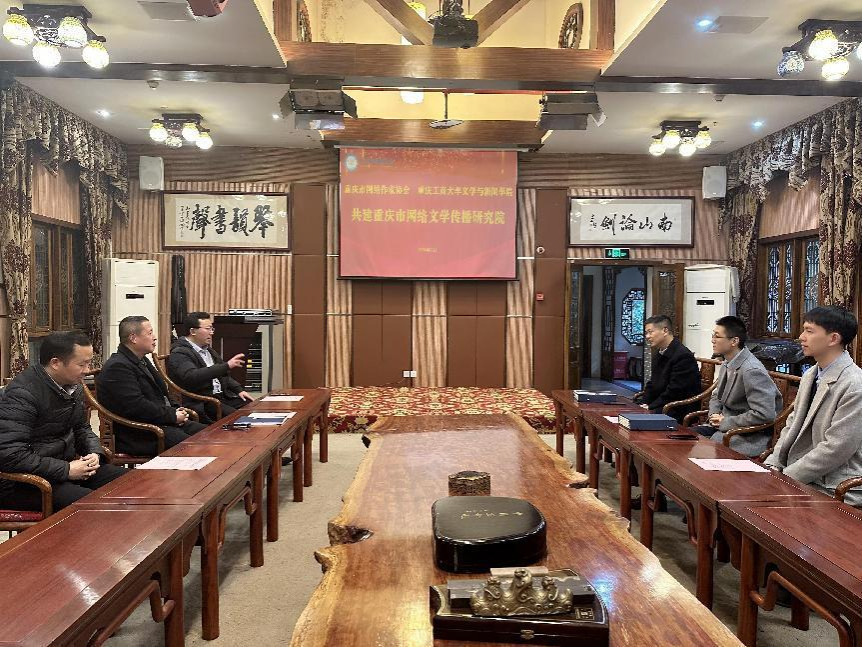 2023年12月8日下午,重庆市网络作家协会与新葡的京集团35222vip在南山书院洽谈并签订《共建重庆市网络文学传播研究院合作协议》。重庆市网络作家协会主席袁锐、党支部副书记吴荻秋思,新葡的京集团35222vip院长殷俊教授、副院长邓伟教授、副书记程元元老师,汉文系周之涵老师、曾妍老师、王彦杰老师,新闻系谭成老师,广电系谈华伟老师参加此次会议。